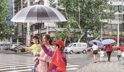 昨日下午,記者在黃石大道與延安路十字路口拍下暖心一幕:一位抱著孩子的市民正在路口等待交通指示燈,準備過馬路,一名文明創建勸導員主動上前,默默地在其背后為他們撐傘擋雨,直至綠燈亮起,市民離開。