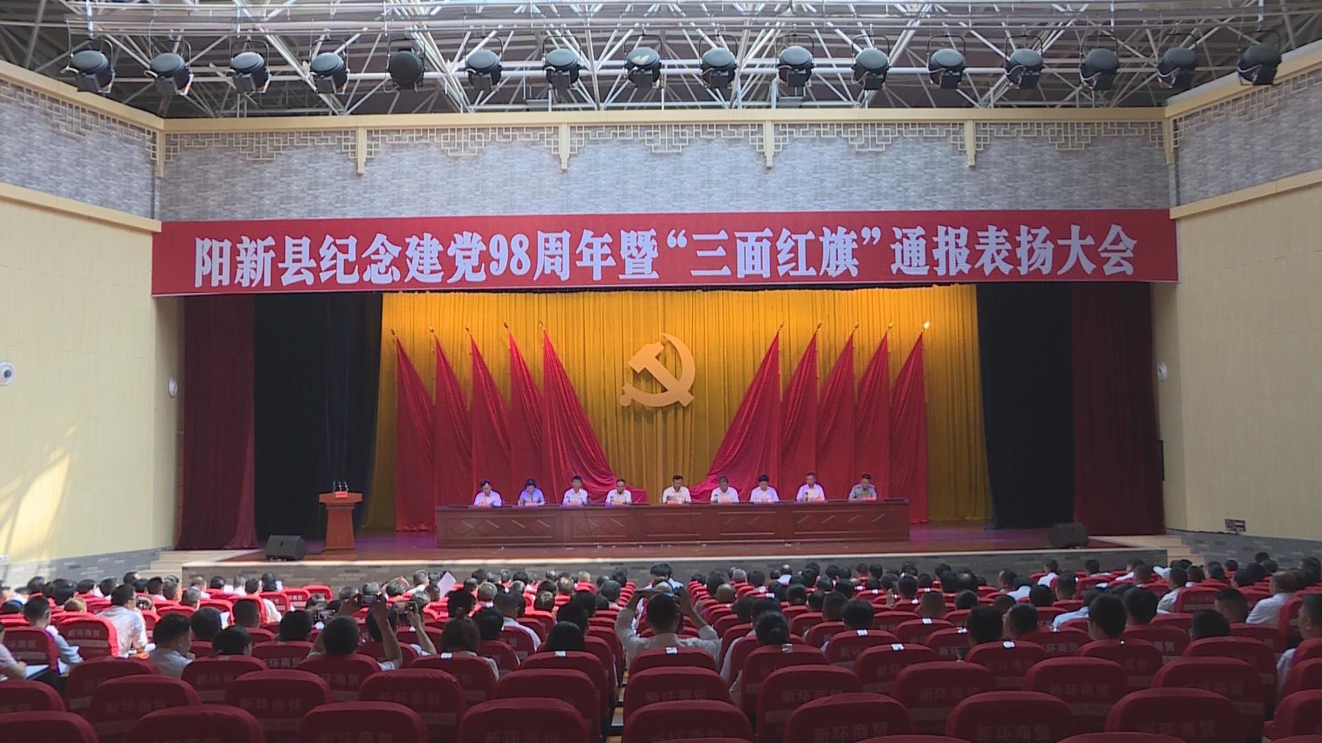 云上陽新(記者:孫明輝)27日上午,陽新縣紀念建黨98周年暨“三面紅旗”通報表揚大會在園博園召開。縣領導明進華、黃錫鋼、楊波、蔡卿、程漢忠、華黃河、盧素琴、李利、楊永旺等出席會議。