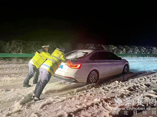 黃咸高速民警救助陷入積雪中的車輛。通訊員 供圖
