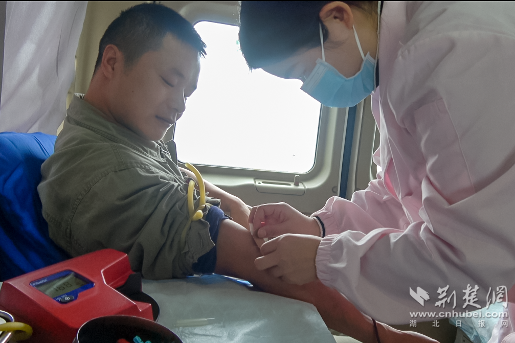 “血壓、血液檢查都蠻好。”“來這邊,身體放松,拳頭握緊。”狹小的獻血車內,黃石血站的陳護士將黃色橡皮管系在汪小潔胳膊,用一支蘸有碘伏的棉簽進行了消毒后,然后開始了采血。看著塑料管漸漸被血液填充,汪小潔滿臉平和。