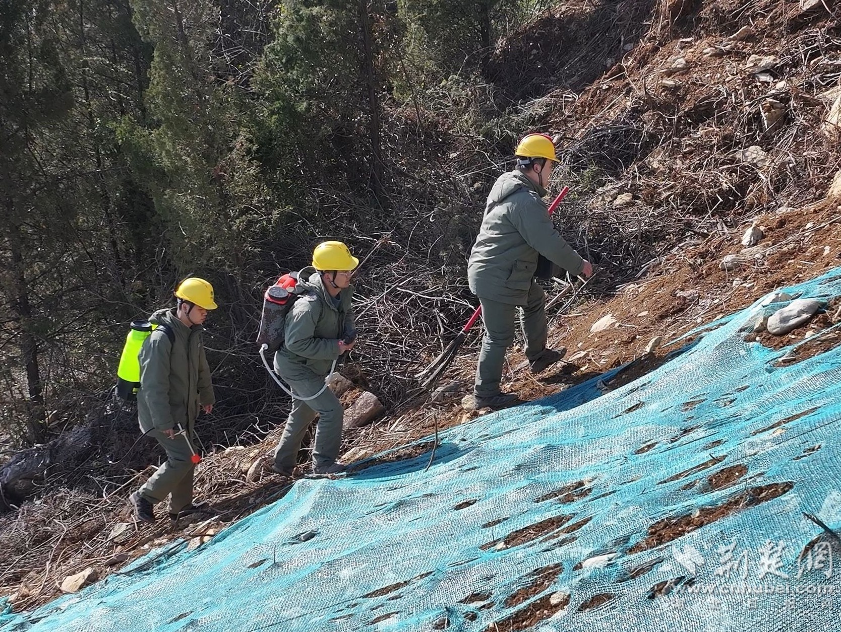 用水箱的水槍噴,用防火拖把打.....三人滿頭大汗,將火點撲滅后,為了防止再燃,他們又對火點周邊的雜草進行澆水和隔離處理,才放心地向下個巡視點奔去。