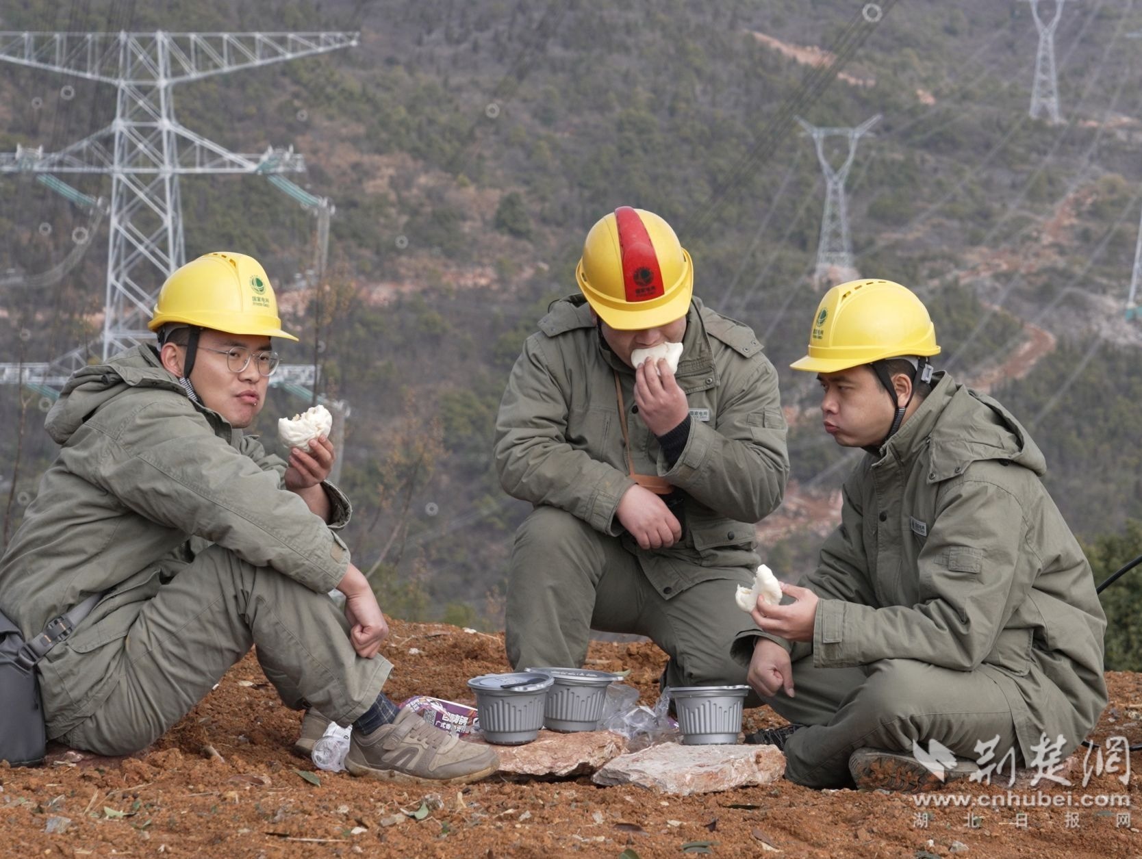 一路跋涉,一路巡視。12點,三人來到了山頂處的314號塔,完成該處巡視任務后,他們在塔下就地而坐。“來,一人一盒,我們也吃個年飯。”武志超將自熱米飯分給大家后,又給一人遞了個饅頭。稍作休整后,三人沿著線路又向另一個山谷跋涉而去。