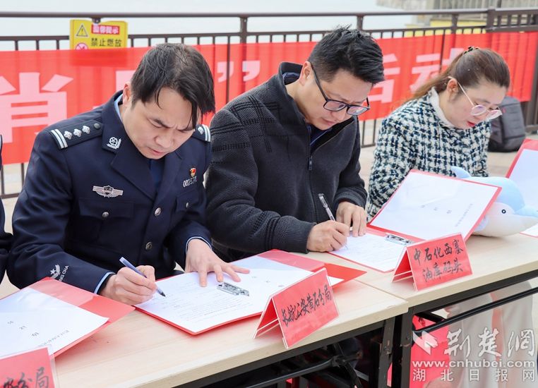 啟動式現場,黃石市花湖小學學生代表向廣大市民發出保護長江倡議。黃石市公安局黃石港分局、長航公安黃石分局、黃石港街道辦事處、黃石日報小記者團、花湖小學以及多家臨江、水上企業負責人共同簽署了守護長江共建共治協議書。