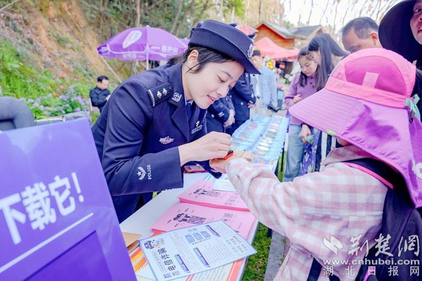 荊楚網(湖北日報網)訊(通訊員 熊靜怡 楊詠晨)3月22日至23日,黃石市第十屆櫻花游園會迎來了首個周末客流小高峰。在這場春日盛景中,黃石市公安局下陸分局民警化身“安全導游”,一抹抹藏藍身影穿梭于花海與人潮,將反詐禁毒宣傳融入賞花游園,用暖心守護為市民游客織就平安防護網。