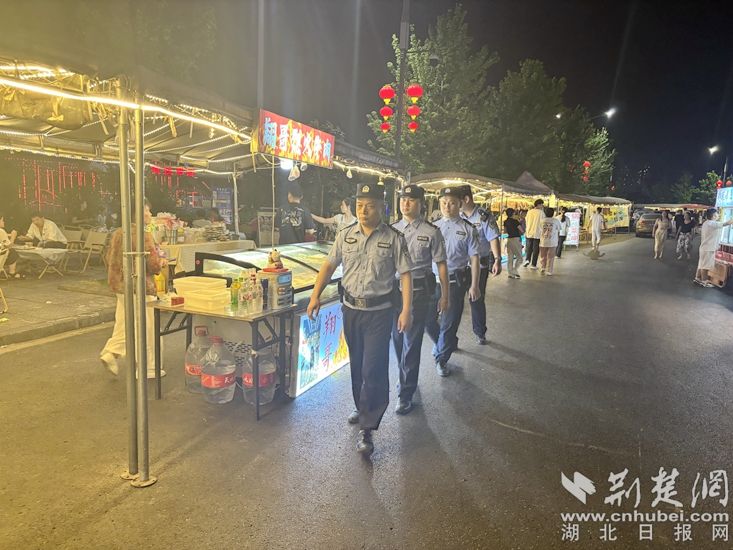夜幕初垂,大冶市恒達夜市霓虹閃爍,人流如織。近百個美食、購物攤位漸次排開,氤氳升騰的煙火氣中,尹家湖派出所巡邏組穿梭其間,點點警用肩燈如星辰般流動,成為夜市里一道獨特的“警”色。