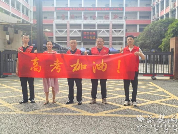 志愿者們在黃石市第六中學門口為考生們加油打氣。通訊員 供圖