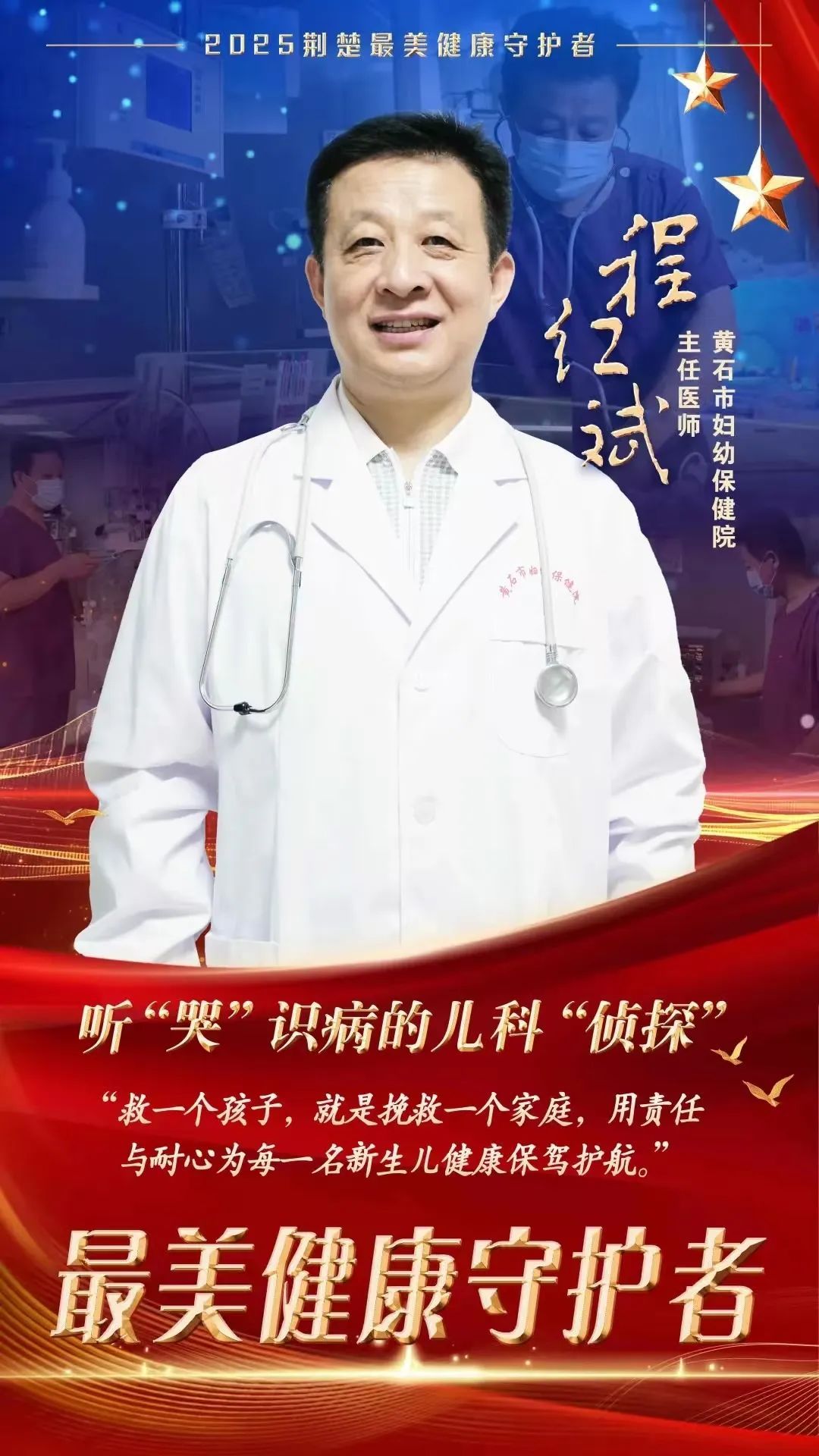 荊楚網(湖北日報網)訊(通訊員 王軍 劉琬婷)精神在傳承中永恒,力量在奮進中凝聚。8月14日晚,在第八個“中國醫師節”即將來臨之際,湖北省衛生健康委員會主辦的《以生命的名義——2025“荊楚最美健康守護者”》致敬禮在湖北廣播電視臺舉辦。本年度10位“荊楚最美健康守護者”名單最終揭曉,黃石市婦幼保健院新生兒科主任醫師、兒童保健部主任、新生兒科主任、兒科主任程紅斌獲評2025“荊楚最美健康守護者”。