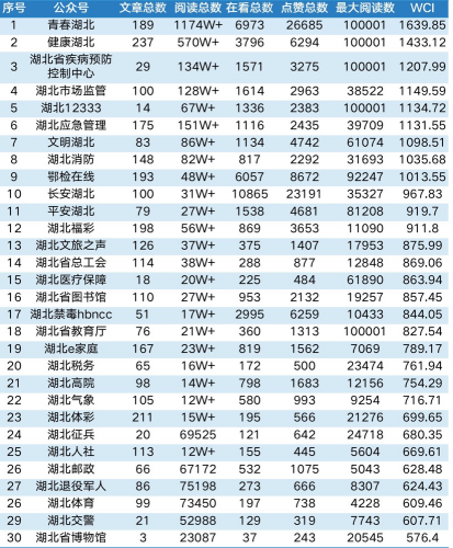 從榜單各項指數(shù)來看,“青春湖北”的閱讀總數(shù)、在看總數(shù)、點贊總數(shù)、WCI等多項指標表現(xiàn)出色,均位于各項指標之首。從文章總數(shù)來看,“健康湖北”以237篇的發(fā)文數(shù)位居該項指數(shù)榜首,“湖北體彩”“湖北福彩”“鄂檢在線”位列其后,發(fā)布文章數(shù)分別為211篇、198篇和193篇。
