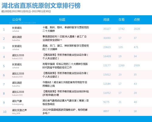 2022年11月閱讀量前十原創(chuàng)文章榜單中,“長安湖北”表現(xiàn)亮眼,共攜3篇優(yōu)質(zhì)文章入榜。“湖北12333”表現(xiàn)較為突出,有3篇文章進入榜單。此外,“湖北體彩”“湖北文旅之聲”“湖北省圖書館”均有1篇文章入榜。