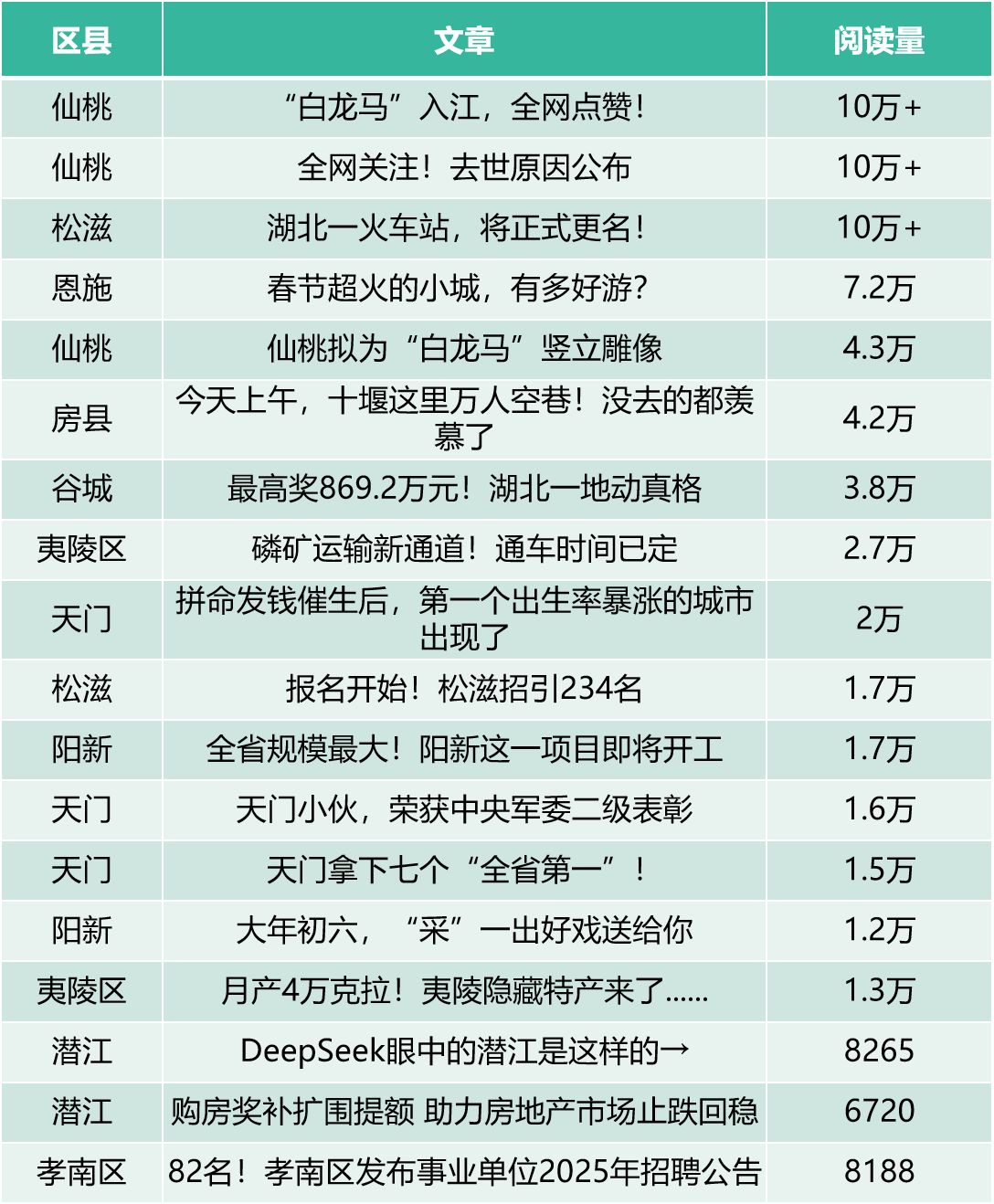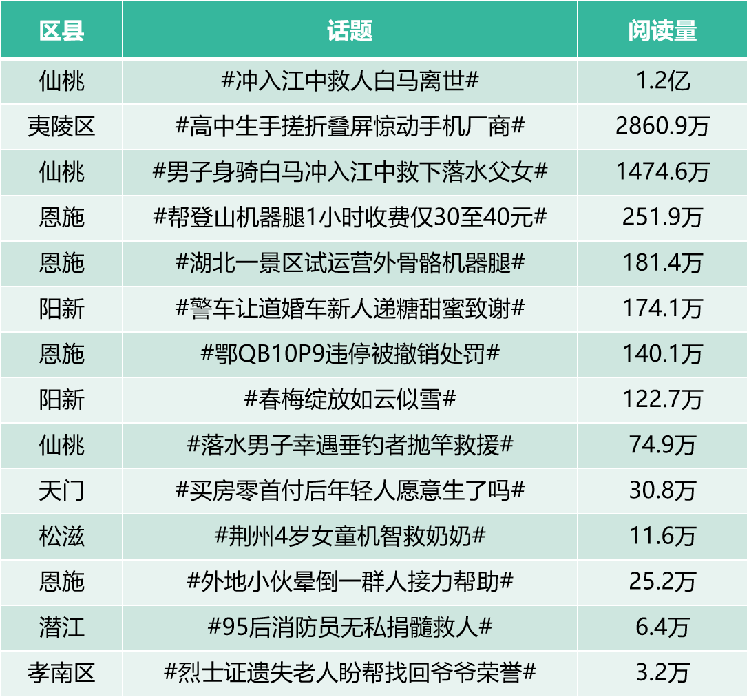 2025年3月20日,由荊楚網(湖北日報網)、楚天輿情數據研究院制作的湖北區縣2025年2月傳播亮點分析報告出爐。其中,仙桃市“白馬俠客”正能量塑造城市大愛形象,“幫登山機器腿”新科技應用助力恩施市成為熱門頂流,夷陵區一高中生“手搓”折疊屏手機讓網民評價“有雷軍潛質”。