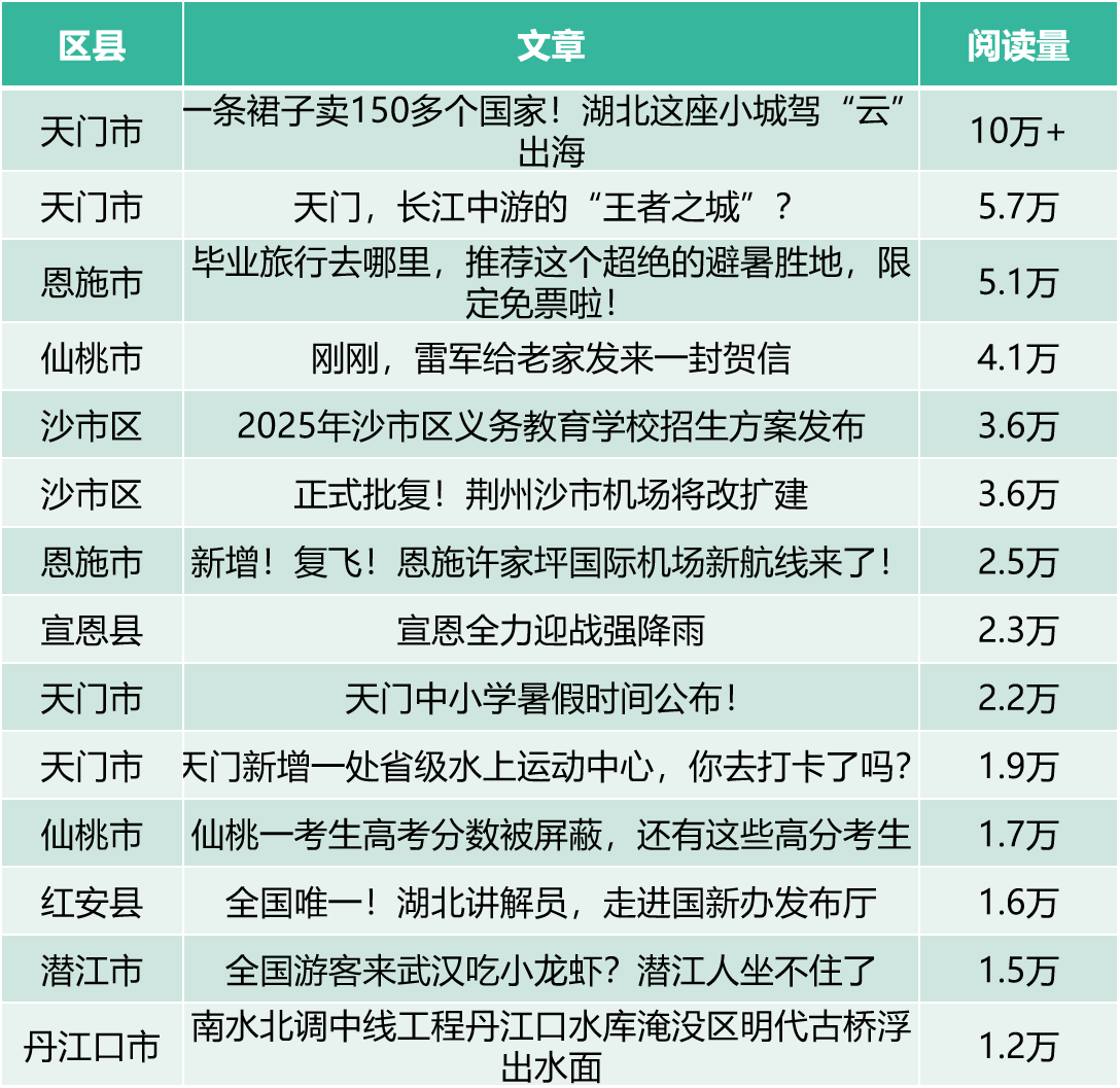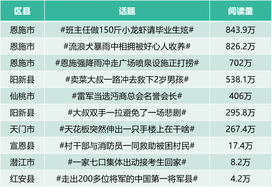 從媒體報道情況來看,央省媒體多角度聚焦湖北區(qū)縣的創(chuàng)新實踐與發(fā)展成就。其中,仙桃、陽新、潛江、天門等多地主流媒體報道數(shù)量位居前列,唱響湖北區(qū)縣高質(zhì)量發(fā)展主旋律。從微博平臺熱門話題來看,輿論關(guān)注熱點內(nèi)容涵蓋救災(zāi)防洪、高考、民生等多個領(lǐng)域。從微信平臺熱門文章來看,相關(guān)內(nèi)容主要包括文旅、教育、交通、歷史文化等領(lǐng)域。相關(guān)信息通過多維度傳播湖北區(qū)縣的正面形象,進一步增強城市文化軟實力和影響力。