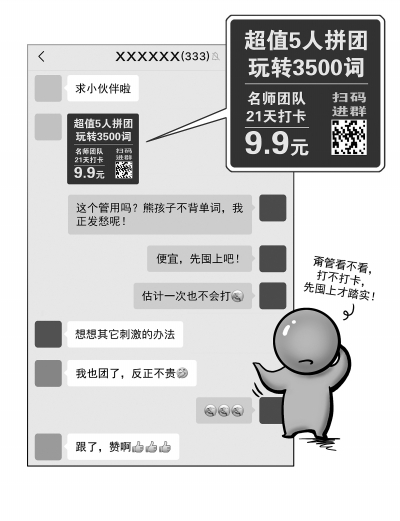 苗苗媽媽還發(fā)現(xiàn),網(wǎng)課中暗藏不少陷阱。“本來看到網(wǎng)上有免費(fèi)的國學(xué)班,只要加了群,每天發(fā)朋友圈打卡就行,結(jié)果只是些粗制濫造的音頻,配上幾張插圖,反倒是上百人的群里每天有各種廣告騷擾,說到底無非是商家打著免費(fèi)的旗號(hào),讓我們幫著給圈粉。”