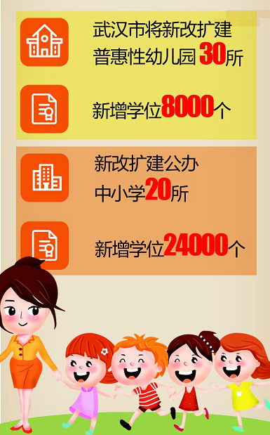 今年,武漢市將新改擴建普惠性幼兒園30所,新增學位8000個。新改擴建公辦中小學20所,新增學位2.4萬個。提升43所鄉村小規模學校和104所鄉鎮寄宿制學校辦學條件。多措并舉使全市大班額比例進一步下降,消除超大班額。