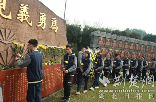 荊楚網客戶端—荊楚網消息(記者許文秀)4月3日上午,武漢市光谷九峰中學七年級師生代表與市見義勇為基金會、長江救援志愿隊等單位及見義勇為英烈家屬、社會群眾,在九峰山安林苑武漢市見義勇為英烈碑廣場舉行清明祭掃活動,共同緬懷長眠在此的見義勇為英烈。