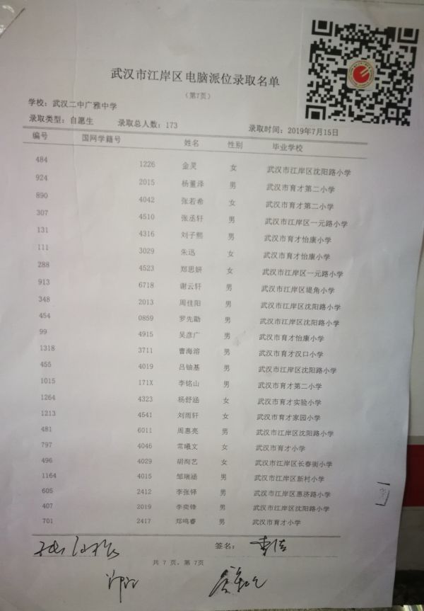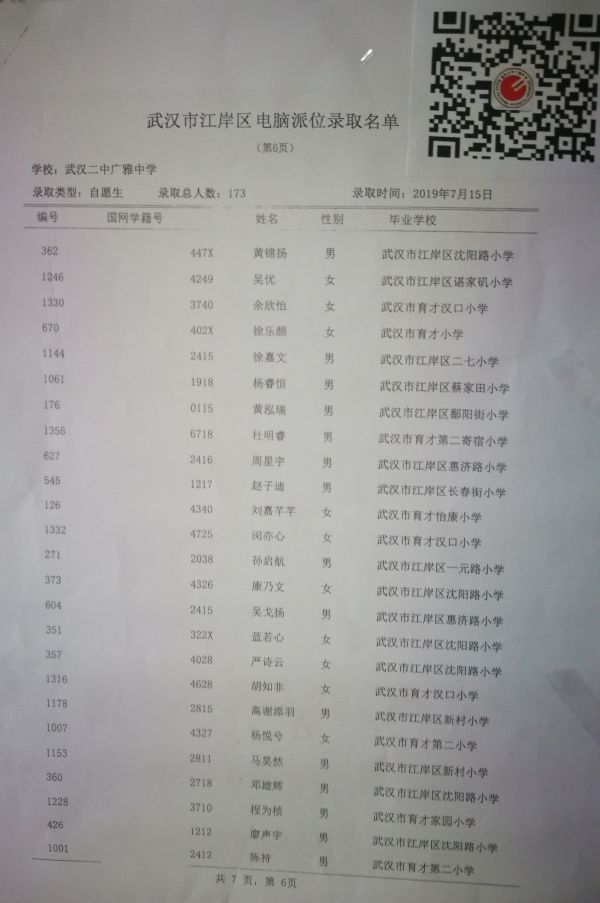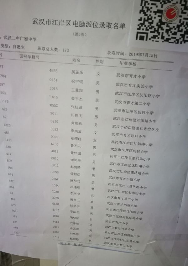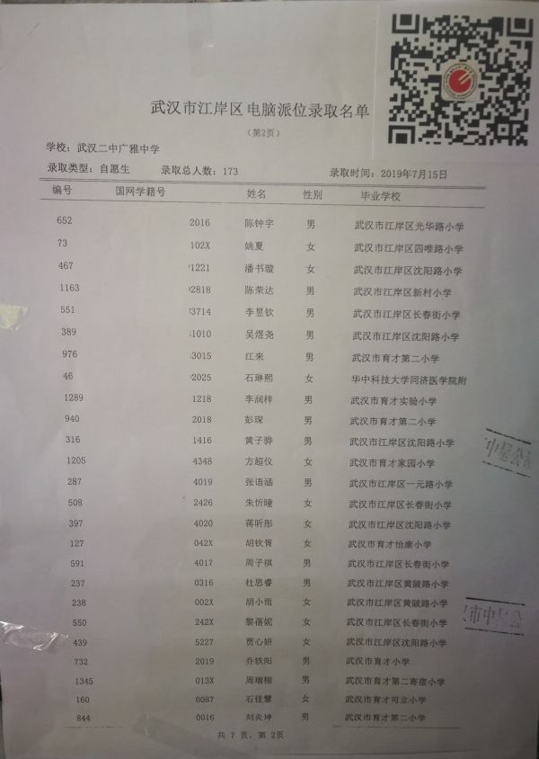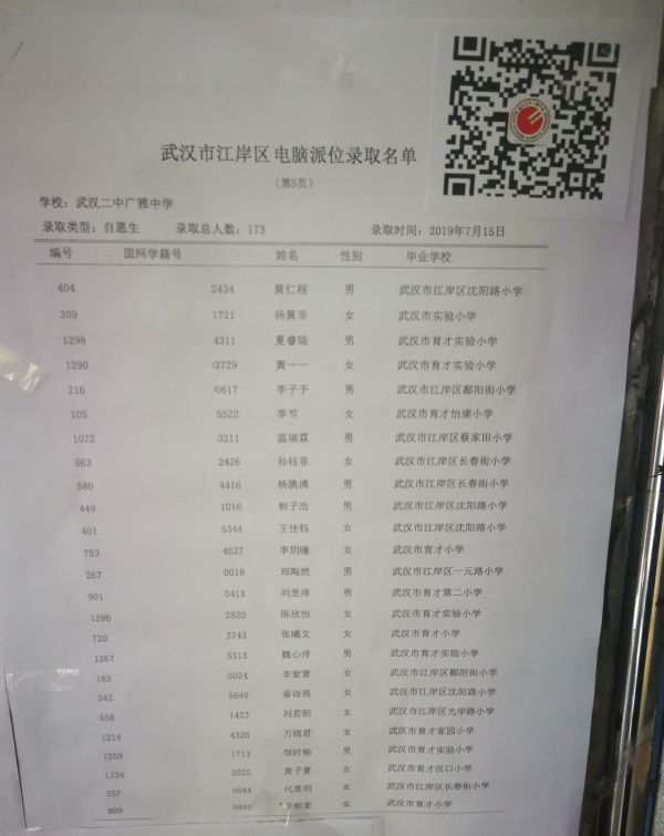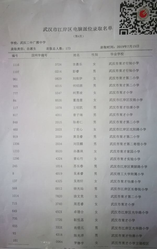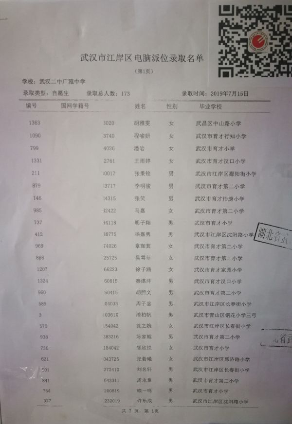 7月15日,武漢二中廣雅中學公布了小升初“搖號”結果,如下圖: