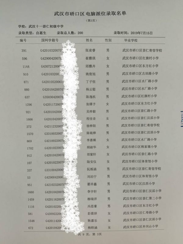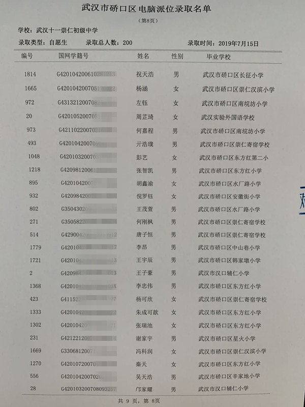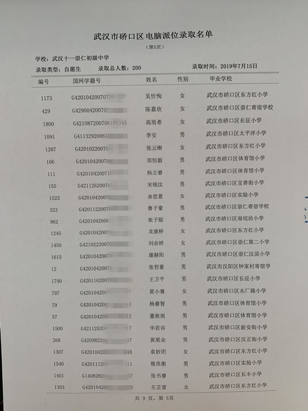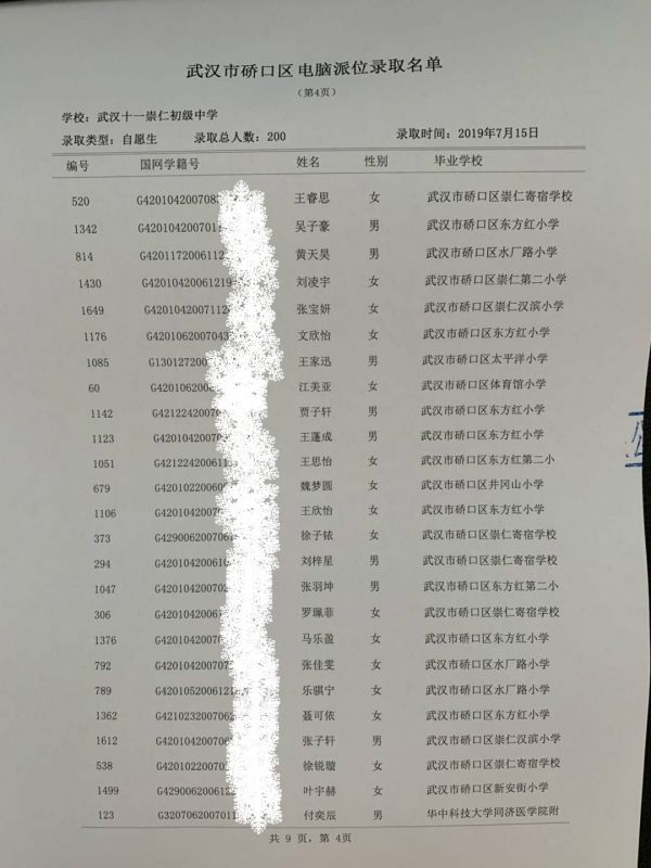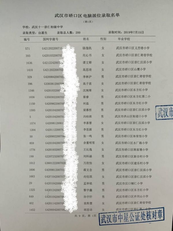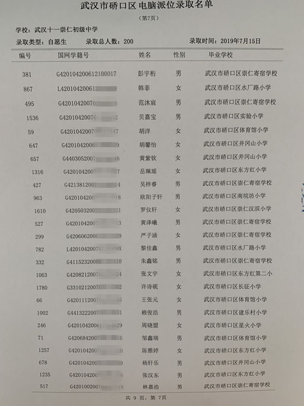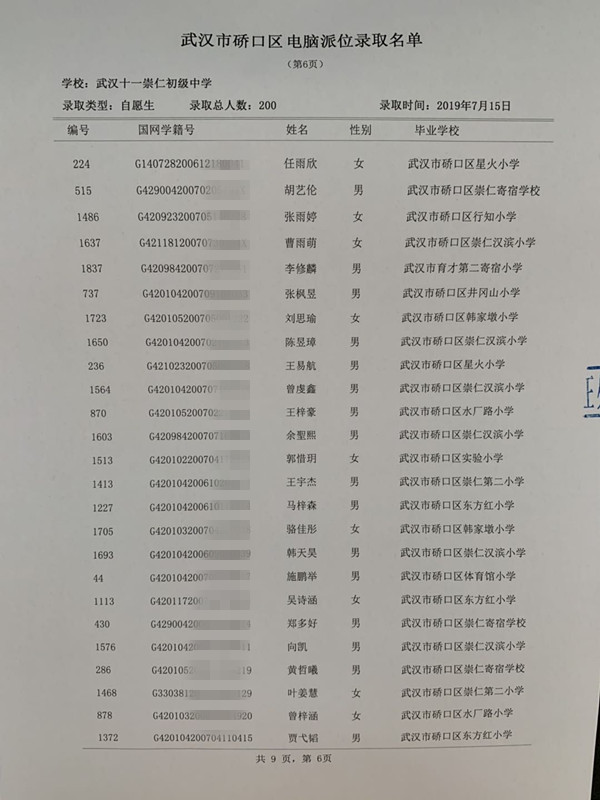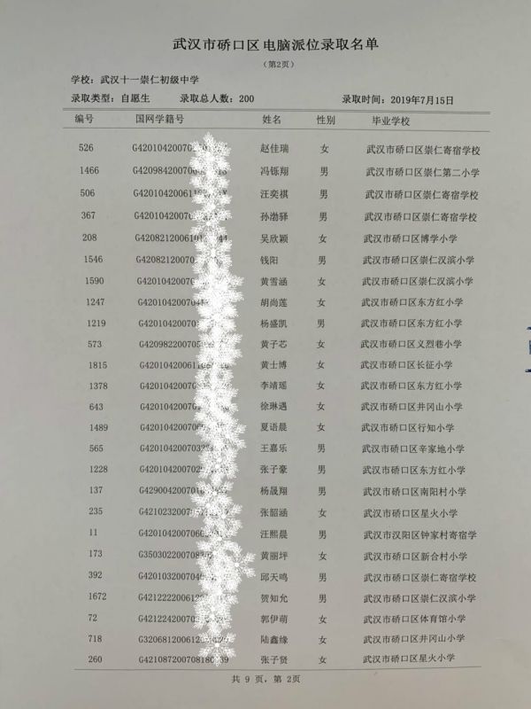 長江日報融媒體7月15日訊(記者向潔)剛剛,武漢十一崇仁初級中學電腦派位“中簽”名單出爐。據悉,今年該校“電腦派位”實際報名人數有1853人。