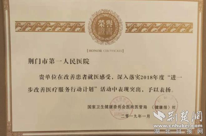 荊門市第一人民醫(yī)院被授予全國“2018年度改善醫(yī)療服務(wù)優(yōu)秀醫(yī)院”稱號(hào)。通訊員供圖