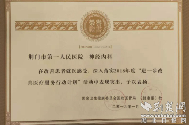 荊門市第一人民醫(yī)院神經(jīng)內(nèi)科被授予全國“2018年度改善醫(yī)療服務(wù)優(yōu)秀科室”稱號(hào)。通訊員供圖