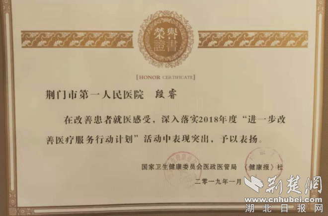 荊門市第一人民醫(yī)院院長段睿則獲得全國“2018年度改善醫(yī)療服務(wù)優(yōu)秀個(gè)人”稱號(hào)。通訊員供圖