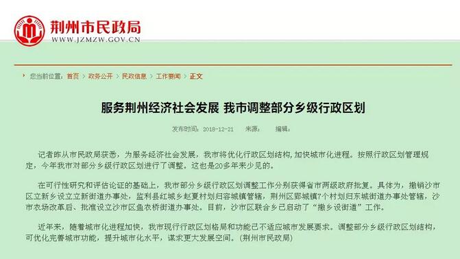 據荊州市民政局官網21日消息,按照行政區劃管理規定,今年該市對部分鄉級行政區劃進行了調整,這也是20多年來少見的。