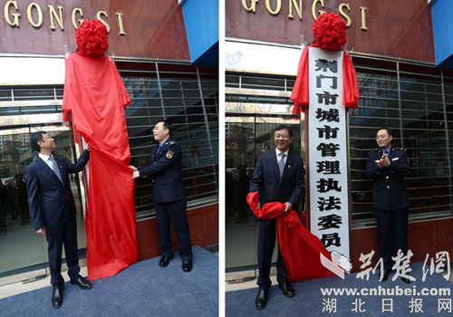 市委常委、市政府黨組成員趙俊,市城市管理執法委員會黨組書記張勇共同為“荊門市城市管理執法委員會”揭牌,也揭開了我市城市管理工作的新篇章。