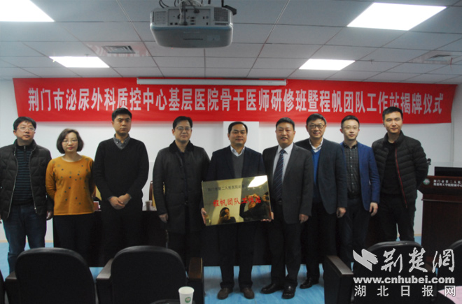 荊楚網客戶端-荊楚網消息(通訊員 鄭琴清)近日,荊門市泌尿外科質控中心基層醫院骨干醫師研修班暨程帆團隊工作站揭牌儀式在荊門二醫舉行。武漢大學人民醫院副院長、泌尿外科主任程帆,華中科技大學附屬武漢市中心醫院泌尿外科主任郭永連,荊門市衛計委醫政醫管科科長曾予出席揭牌儀式。揭牌儀式由荊門市第二人民醫院泌尿外科主任鄧全紅主持。來自基層醫療機構的三十多名醫生參加了儀式。