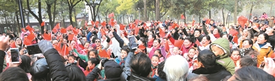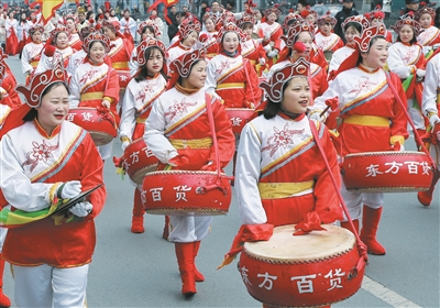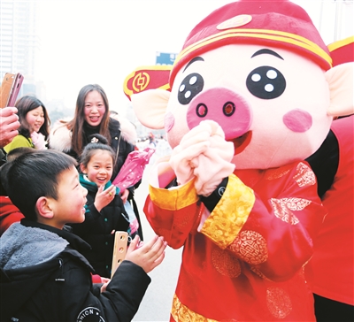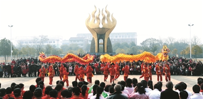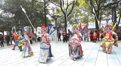屈家嶺:2月19日,由11個方陣420人組成的屈家嶺管理區2019元宵節踏街巡游將城區群眾帶入濃厚的節日氛圍中。圖為在農谷廣場進行舞龍表演。 梁剛 攝