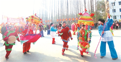 京山:2月19日,來自京山武校、城畈社區等單位的民俗節目表演隊,開展了各種民俗節目表演。圖為采蓮船表演。 黃小明 攝