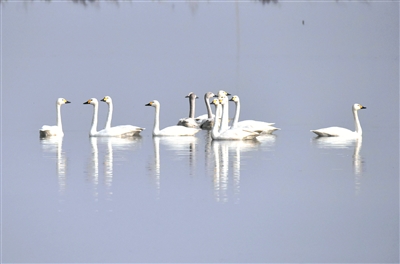 當年飛回借糧湖越冬的天鵝有30多只。這些美麗的白天鵝悠閑自得,站立在湖水淺灘中曬太陽,舒展羽翅,而且潔白的倩影倒映在明鏡般的湖水里顯得格外亮麗。