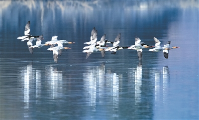 中華秋沙鴨,為中國特有珍稀鳥類,世界瀕危動物,屬第三紀冰川期后殘存下來的物種,距今已有一千多萬年,是中華鳥類“活化石”,由于數量極其稀少,被譽為“水上飛羽大熊貓”。每年11月初,中華秋沙鴨從北方南遷至漳河及長江流域地區越冬;第二年3月底,中華秋沙鴨又從越冬地北遷回東北繁殖。