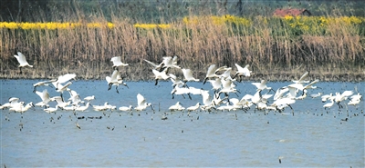 在浩浩長湖,清冷而寬闊的水面上,成群的鳥兒自由地飛翔、歡快地覓食。2月底,荊門市愛鳥文化研究會鳥類觀察員在長湖發現了200多只珍稀白琵鷺。白琵鷺的出現,標志著長湖的生態環境已經發生了根本性好轉。