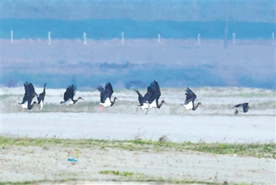 那天,在陽光的照耀下,奔騰不息的漢江波光粼粼,8只黑鸛在江心洲上悠閑地梳理著羽翅。當放哨的黑鸛發現岸邊有異常情況時,突然帶領群聚的黑鸛張開飛羽一路奔跑,騰空而起,瞬間在空中形成一條黑色的飛行線,翱翔漢江上空,十分壯觀。