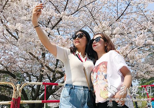 荊門“網紅打卡地”櫻花盛開,不少市民與其合影留念。通訊員供圖