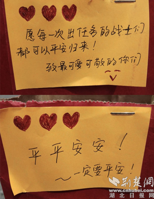 據了解,在4月3日晚,也有熱心市民將滿滿兩大袋餅干、薯片等零食送到特勤中隊崗亭值班人員手中,并在卡片上寄語:“平平安安,一定要平安!”“愿每一次出任務的戰士們都可以平安歸來!”