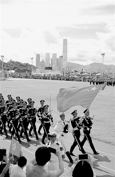 升國旗儀式是軍營開放活動的重頭戲。莊嚴的升國旗儀式,激起了香港市民的愛國情愫。升旗儀式前,駐香港官兵分別用普通話和粵語向香港市民介紹國旗知識。在雄壯激昂的國歌聲中,市民紛紛起立,注視著鮮艷的五星紅旗冉冉升起,同聲高唱國歌。當國旗升到旗桿頂端,人群中爆發出雷鳴般的掌聲。