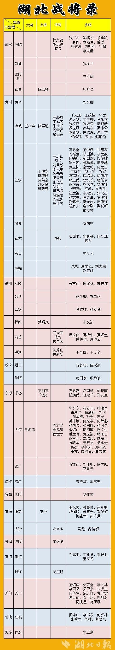 自1955年至1965年間,中華人民共和國共授予或晉升10名元帥、10名大將、57名上將、177名中將、1360名少將,湖北籍的有236名,數量全國第二。