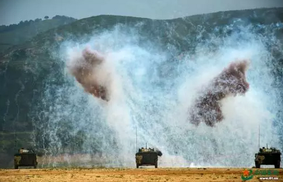 開幕式中,國產ZBD-03空降戰車在進行實彈射擊(沈玲 via 中國軍網)