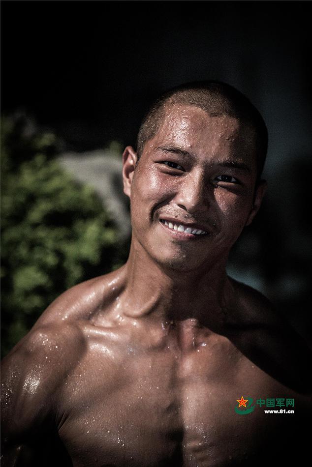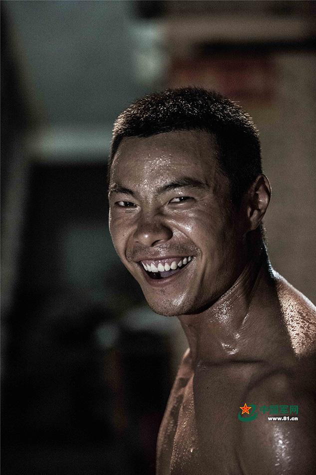 偵察兵夜間體能訓練,看到攝影師在拍照露出一口潔白的牙齒。王佳寅攝影