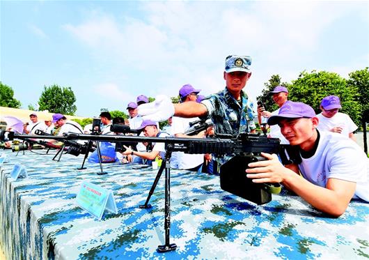 圖為:市民在部隊官兵的指導下體驗武器裝備。(湖北日報全媒記者 張朋 通訊員 何武濤 實習生 王梓涵 攝)