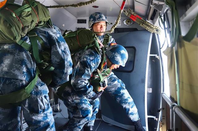“雖然氛圍讓我感到有點緊張,但是我相信跳傘是科學的,我們的地面動作已經達到標準,今天我一定能跳好。”通過三道檢查線,新兵李博和戰友們邁著堅定的步伐前往登機線,迎接飛機到來。