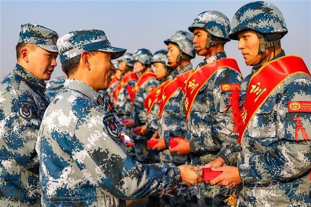 上午11點半,隨著最后一名跳傘員安全著陸,新兵首次跳傘圓滿完成。首跳結束后,他們第一時間組織頒發首次跳傘紀念證章,新兵代表身披紅花綬帶,依次上臺領取紀念證章,為后續跳傘訓練激發熱情。