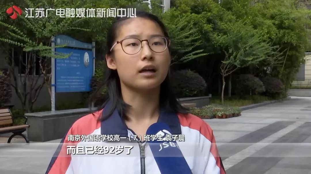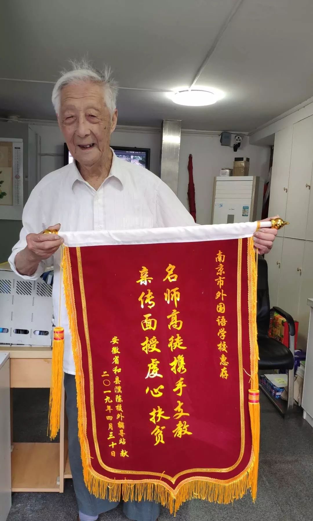 △葉連平老人和他送來的錦旗(圖/南京外國語學校)