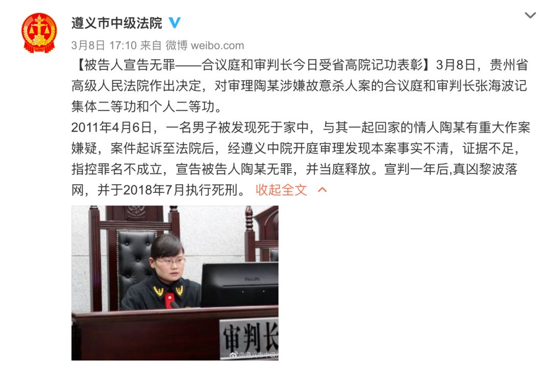 3月8日,貴州省高級(jí)人民法院作出記功決定,對(duì)審理陶某涉嫌故意殺人案的合議庭和審判長張海波分別記集體二等功和個(gè)人二等功。
