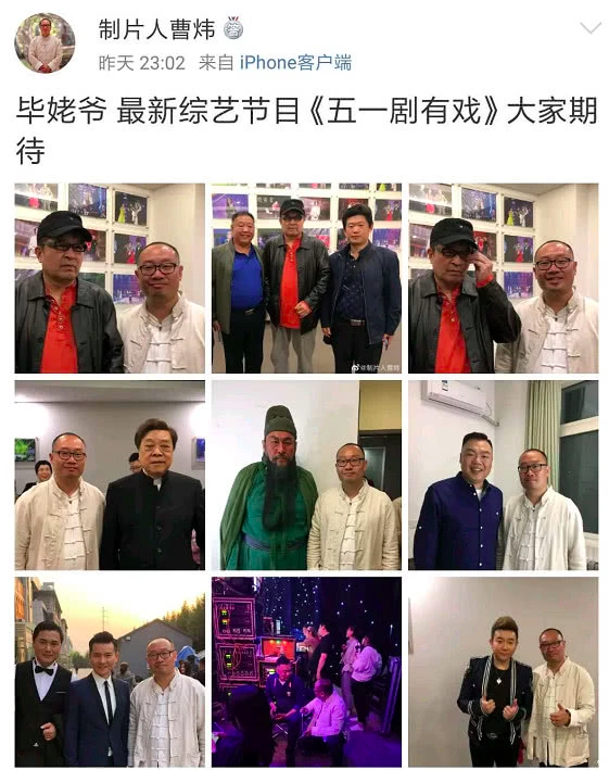 4月17日,央視《星光大道》的評審曹煒在社交平臺上曬出了一組照片,其中就有和畢福劍的合照,他還配文稱,“畢姥爺最新綜藝節目《五一劇有戲》,大家期待”。