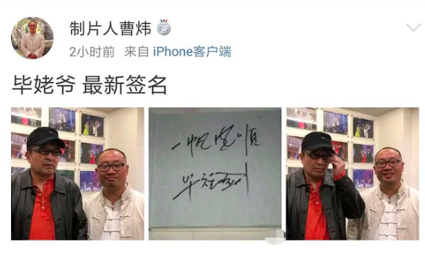 4月18日,曹煒再次曬出了和畢福劍的合影,并且還附上了畢福劍的簽名。除了簽名,畢福劍還給他提了4個字,“一帆風順”。
