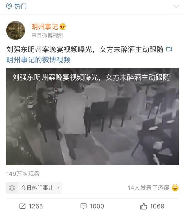 4月22日,微博網(wǎng)友@明州事記 曝光兩段劉強(qiáng)東明州案晚宴視頻,視頻稱“女方舉止親密主動邀請劉強(qiáng)東”“女方未醉酒主動跟隨”。