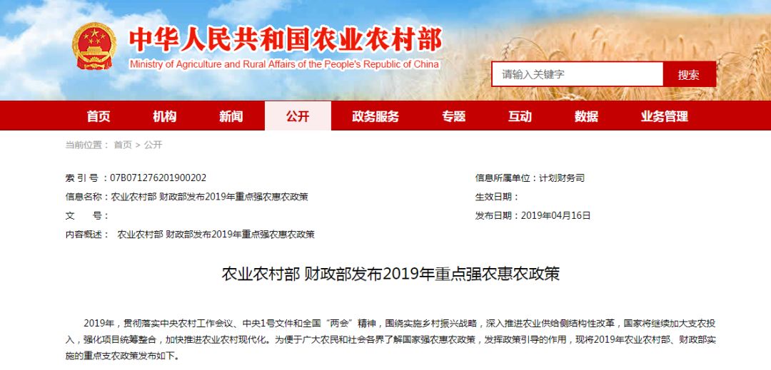 近日,農業農村部、財政部聯合發布《2019年重點強農惠農政策》,這37條政策包含了農業生產發展和流通、農業資源保護利用、農田建設、農業科技人才支撐、農業防災減災、鄉村建設等六大方面。