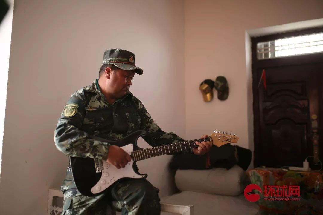 烏什縣英阿瓦提鄉庫奇村撒熱木警務站站長艾麥爾·玉色依乃克在業余時間經常彈奏電吉他來排解寂寞。范凌志攝