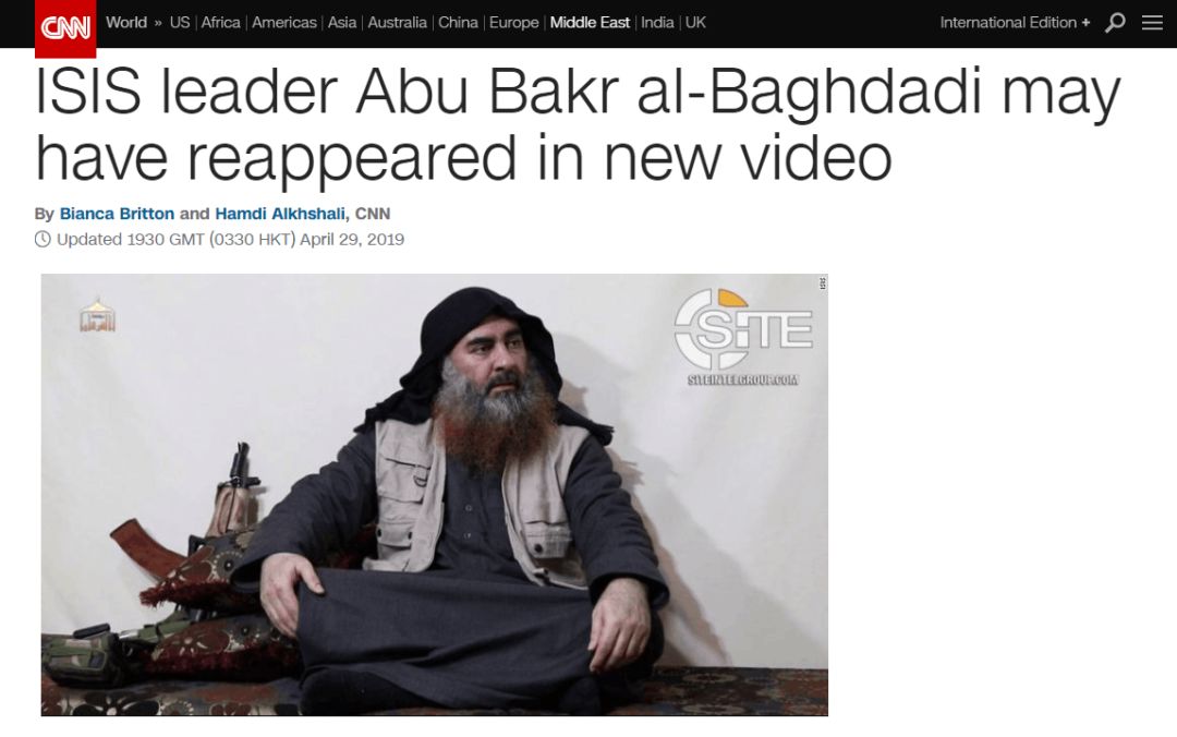 CNN稱,視頻中,一名穿著隨意的男子聲稱自己是巴格達迪,他坐在地上,旁邊豎著一把突擊步槍。他告訴身邊的IS成員:巴古斯(Baghouz)的戰斗“已經結束”。CNN提到,巴古斯是IS在敘利亞東部的最后一個據點。3月下旬,該城鎮被從IS手中被解放出來。