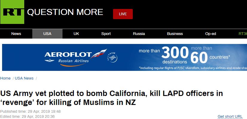 一名美退役老兵密謀在加州策劃爆炸襲擊,為新西蘭“清真寺屠殺”報仇,在實施前一天被捕。